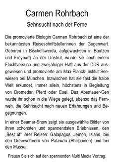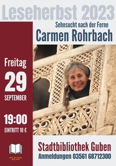 Langersehnt ist auf jeden Fall die erste Begegnung im diesjährigen Leseherbst von allen Anhängern der beliebten Reiseschriftstellerin Carmen Rohrbach. Am 29.09.23 wird sie in einem Multi-Media-Vortrag unter dem Titel „Sehnsucht nach der Ferne“ aus ihrem Leben erzählen und sehr gern alle Fragen beantworten.