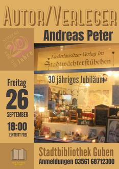 Lesung und Gespräch mit Autor und Verleger Andreas Peter zum 30-jährigen Jubiläum des Niederlausitzer Verlages im Stadtwächterstübchen.