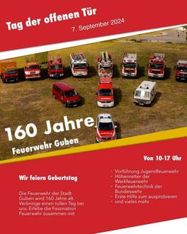 Die Stadt Guben feiert ein besonderes Ereignis: das 160-jährige Jubiläum der Freiwilligen Feuerwehr Guben. Am 07. September 2024 findet aus diesem Anlass ein Tag der offenen Tür statt, bei dem die Bürgerinnen und Bürger die Möglichkeit haben, einen Blick hinter die Kulissen der Feuerwehrarbeit zu werfen. Während des Tages der offenen Tür werden verschiedene spannende Programmpunkte geboten, darunter: