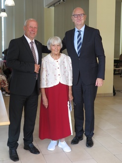 Bürgermeister Fred Mahro und Dietmar Woidke gratulierten Irmgard Schneider.