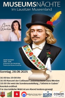 Die Museumsnacht am Sonntag, den 28.09.2025, beim Verein „Gubener Tuche und Chemiefasern“, Gasstraße 4 in Guben, beginnt um 16:00 Uhr mit einem Konzert der Cottbuser Liedermacherin Clara Werden.