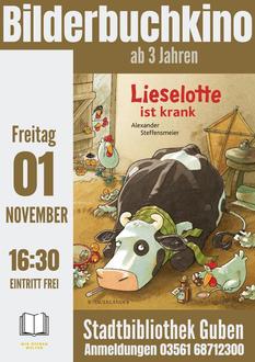 Am Freitag, 1. November 2024, um 16:30 Uhr lädt die Stadtbibliothek Guben alle Kinder ab 3 Jahren zum Bilderbuchkino mit der Geschichte „Lieselotte ist krank“ ein.