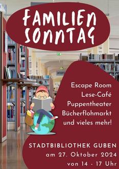 Am Sonntag, 27. Oktober 2024, lädt die Stadtbibliothek Guben von 14:00 Uhr bis 17:00 Uhr zum Familiensonntag unter dem Motto „Bücher öffnen Welten“ ein. Ein spannendes Programm für Groß und Klein erwartet die Besucher, um die Welt der Bücher auf spielerische Weise zu entdecken und dabei die vielfältigen Angebote der Stadtbibliothek zu erleben.