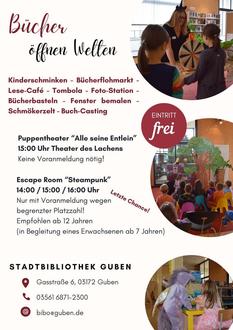 Kinder können sich beim Kinderschminken vergnügen, während Eltern und andere Interessierte im Lese-Café entspannen oder beim Bücherflohmarkt stöbern. Kreative Köpfe haben die Möglichkeit, an verschiedenen Stationen teilzunehmen, wie zum Beispiel einer Tombola, einer Foto-Station, dem Basteln von Buchcovern oder dem Bemalen von Fenstern. Auch das Schmökern in gemütlicher Atmosphäre wird nicht zu kurz kommen. Um 15:00 Uhr wird das Puppentheater „Alle seine Entlein“ vom Theater des Lachens aufgeführt, bei dem die kleinen Gäste herzlich eingeladen sind, ohne vorherige Anmeldung daran teilzunehmen.