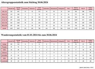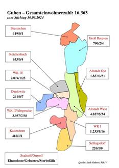 Die Altersgruppen- und Wanderungsstatistik der Stadt Guben zeigt eine differenzierte Verteilung der Bevölkerung und die demografische Entwicklung in den einzelnen Stadtteilen. Mit insgesamt 16.363 Einwohnern sind die Stadtteile Altstadt West und WK II/Altsprucke die bevölkerungsreichsten Bereiche der Stadt. Die Wanderungsstatistik verdeutlicht, dass die Zuzüge (332 Personen) die Wegzüge (264 Personen) mehr als ausgleichen, was auf eine positive Bilanz hinweist. Trotz dieses positiven Trends bleibt die Gesamtentwicklung der Bevölkerungszahl negativ, da die Sterbefälle (161) weiterhin deutlich die Geburten (25) übersteigen. Diese negative Entwicklung der Einwohnerzahlen stellt nach wie vor eine Herausforderung für die Stadt dar. Insgesamt ergibt sich ein Rückgang der Bevölkerung um 68 Personen, was den langfristigen Trend einer sinkenden Einwohnerzahl in Guben unterstreicht.
