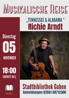 Am Dienstag, 05. November 2024, um 18:00 Uhr lädt die Stadtbibliothek Guben zu einer musikalischen Lesung mit Richie Arndt ein. Nach seiner Reise durch Mississippi zu den Ursprüngen von Blues, Soul, Rock ’n’ Roll und Jazzmusik reist Richie Arndt 2023 erneut in den Süden der USA und begibt sich auf eine weitere musikalische Spurensuche. Was könnte da näherliegen, als den „Soundtrack of America“ zu erkunden – und der liegt in Tennessee mit seinen Musikmetropolen Memphis sowie Nashville. Dort schlägt das Herz der amerikanischen Musik.