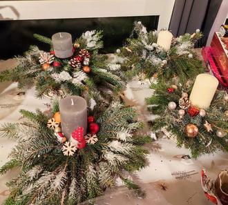 Große Hände halfen dabei den Kleinen und Kleinsten. Aus Baumscheiben, Steckmasse, Reisig, Kerzen und bunter Weihnachtsdeko zauberten die Kinder tolle Gestecke für die bevorstegende Adventszeit.