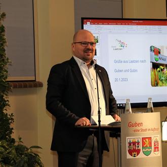 Gubens Bürgermeister Fred Mahro und das Gubiner Stadtoberhaupt Bartłomiej Bartczak haben am Freitagabend, 20. Januar 2023, rund 110 Gäste aus Wirtschaft, Politik, Vereinsleben und Gesellschaft zum gemeinsamen Neujahrsempfang der deutsch-polnischen Doppelstadt in der Alten Färberei empfangen.