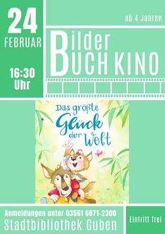 Bilderbuchkino ab 4 Jahren, Eintritt ist frei! Um Voranmeldung wird gebeten unter (03561) 6871-2300 oder bibo@guben.de.