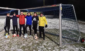 Die Hoffnungsträger für den Gubener Fußball freuen sich über das neue Kleinfeldtor.