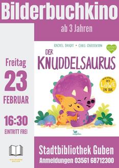 Die Stadtbibliothek Guben lädt am 23. Februar 2024, um 16:30 Uhr zum Bilderbuchkino ein. Der kleine Knuddelsaurus stromert durch den Wald und freut sich, als er auf andere Dino-Kinder trifft - so viele neue Freunde zum Spielen! Doch seine gute Laune wird getrübt, als bei einer Runde Verstecken aus ein bisschen Gezanke ein schlimmer Streit wird. Traurig fragt sich der Knuddelsaurus, was er nur tun kann, damit sich alle Dinos wieder vertragen. Was ein Glück, dass ihm die Geheimzutat seines Papas einfällt ... Eine knuddelschöne Geschichte darüber, wie eine Umarmung die Welt ein bisschen besser machen kann.