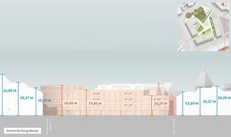 Entgegen der Befürchtungen aus der ersten Bürgerversammlung wird sich die geplante Bebauung in die umliegende Struktur einfügen, wie man an den Höhenvergleichen erkennen kann.