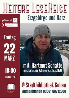 Im Rahmen des diesjährigen Bücherfrühlings stellt Schatte mit „Kalte Fieß und fette Torte“ sowie „Arme Ritter und blanke Hexen“ zwei Bände mit Reisegeschichten aus dem Erzgebirge und dem Harz vor, wobei sich die Leser auf viel Heiteres freuen dürfen. Und dennoch bittet unser Gast: „Ernst nehmen müssen Sie meine Geschichten aber trotzdem. Denn: Je ernster man sich einer Sache widmet, desto mehr Spaß hat man daran.“