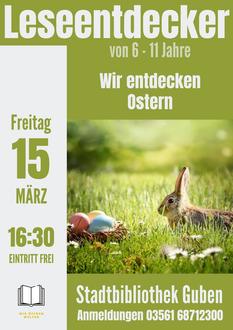 Jeden Monat treffen wir uns und erkunden gemeinsam ein spannendes Thema. Bei unseren Treffen gibt es fesselnde Geschichten, knifflige Rätsel und kreative Bastelaktionen. Am 15. März 2024 um 16:30 Uhr entdecken wir das Thema Ostern. Dieses kostenlose Angebot richtet sich an Schülerinnen und Schüler im Alter von 6 bis 11 Jahren. Wir hoffen, euch bei den Leseentdeckern begrüßen zu dürfen!