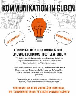 Wenn Sie sich an der Gestaltung der Umfrage beteiligen und gemeinsam mit der BTU, der Stadt Guben und der Stadt Spremberg an den Fragen mitwirken möchten, kommen Sie am 21. März 2023 um 14:00 Uhr auf den Hauptcampus der BTU in das Lerngebäude 10, Raum 111. Für weitere Informationen wenden Sie sich bitte an Ihre Ansprechpartnerin Katarzyna Maj (telefonisch: (03561) 6871-1444 oder per Mail: maj.k@guben.de).