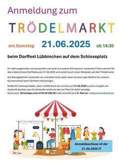 Im Rahmen des Dorffestes in Lübbinchen am Samstag, 21. Juni 2025, ab 14:30 Uhr auf dem Schlossplatz, findet auch in diesem Jahr wieder ein bunter Trödelmarkt statt. Wer Krimskrams, Schätze oder Selbstgemachtes anbieten möchte, kann sich noch bis Montag, 21. April 2025, anmelden. Standgebühren werden nicht erhoben – stattdessen wird um eine Kuchenspende für den Verkauf während des Dorffestes gebeten.