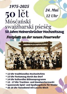 Vor 50 Jahren hat sich der Hochzeitszug in Heinersbrück gegründet. Aus diesem Anlass möchten wir die Domowina-Ortsgruppe Heinersbrück zu diesem Jubiläum einladen. Das Fest findet am Samstag, 24. Mai 2025, in Heinersbrück statt. Beginn ist um 12:00 Uhr mit dem traditionellen Hochzeitsfoto auf dem Festplatz neben der neuen Feuerwehr. Im Anschluss sammelt sich der Hochzeitszug mit all seinen Gästen zum Festumzug an der Buswendeschleife (Ecke Hornoer und Jänschwalder Straße). Start des Umzuges um 13:00 Uhr zum Festplatz. Dort folgen ab 14:00 Uhr ein vielfältiges und buntes Bühnenprogramm. Den Abschluss des Tages begehen wir mit einem Tanzabend ab 18:00 Uhr mit Lausitz Blech.