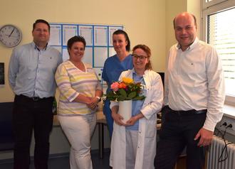 Das Team der Praxis steht bereit: v. l. Jens Täubner, Stefanie Donath, Schwester Katja und Dr. Christin Schäfer. Gratulation von Geschäftsführer Andreas Mogwitz (r.). © DIAKO NWG