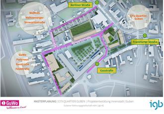 Die Gubener Innenstadt bekommt ein neues Gesicht: Das, was einst Industrievorstadt war, soll in den kommenden Jahren zum belebten Stadtzentrum entwickelt werden. Zwischen Berliner Straße und Feldstraße werden Wohnungen entstehen, Büros und Gewerbe sowie neue Angebote für Freizeit und Tourismus. „Wir wollen, dass die Altstadt Ost wieder zum lebendigen Zentrum für Guben wird“, wünscht sich GuWo-Geschäftsführer Martin Reiher. Damit das gelingt, sollen wichtige Funktionen wie Arbeiten, Dienstleistungen, Einzelhandel, Bildung, Freizeit und Versorgung rund um das Gubener Dreieck konzentriert werden – durch den Bau des City Quartiers und durch Neu- und Umbauten und neue Wegeführungen an den umliegenden Straßen. Zudem wird ein neues Wohnquartier im Tuchmacherviertel an der Neiße entstehen. Die Altstadt-Ost wird durch die neuen Angebote zur Innenstadt der kurzen Wege. Das Gewerbe und die Dienstleistungsangebote bringen Kundschaft und Beschäftigte in die Innenstadt – so wird das City Quartier zum Frequenzbringer, von dem auch das bestehende Gewerbe und die Händler in der Frankfurter Straße profitieren werden. Ein weiterer positiver Nebeneffekt: Durch die Neubelebung des Viertels wird die Verbindung zur Nachbarstadt Gubin gestärkt. Bei den Planungen wurde darauf geachtet, die Altstadt nicht komplett zuzubauen, sondern bewusst Grünflächen zu erhalten und zu schaffen. Wir stellen die wichtigsten Vorhaben hier vor: