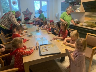 Anschließend ging es an die Arbeit: Unter der Anleitung der Erzieher und mit Unterstützung des Pflegepersonals rollten die Kinder den Teig aus und stachen Plätzchen in allen Formen aus.