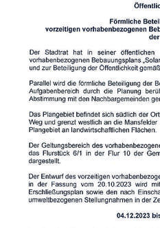 Förmliche Beteiligung der Öffentlichkeit zum vorzeitigen vorhabenbezogenen Bebauungsplan „Solarpark Gerbstedt, OT Thondorf“ der Stadt Gerbstedt