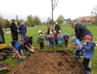 Bei der Pflanzung griff der Bürgermeister Herr Döring selbst zur Schaufel und bekam dabei tatkräftige Unterstützung durch den stellvertretenden Ortsbürgermeister von Friedeburg Herr Jangel und den fleißigen Händen der Kinder, der ortsansässigen Kindertagesstätte „Spatzennest“.