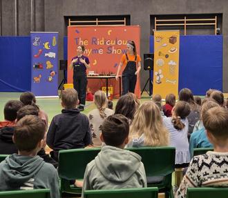 Am Donnerstag, dem 8. Januar 2026, verwandelte sich die Turnhalle unserer Grundschule in eine Bühne voller Spaß und englischer Sprache. Mit der „The Ridiculous Rhyme Show“ sorgten zwei Darstellerinnen aus England für große Begeisterung bei Groß und Klein. „The Ridiculous Rhyme Show" ist ein interaktives Englisch-Theater, das Sprache mit Spaß verbindet und den Kindern auf unterhaltsame Weise die englische Sprache näherbringt.