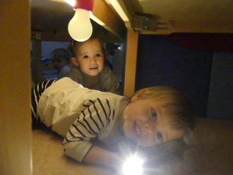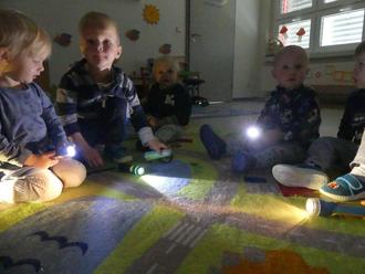 12 kleine Taschenlampen leuchteten uns alles hell. In der Woche vom 14.11. - 17.11.2023 fand bei uns in der Krippe eine Projektwoche zum Thema „Taschenlampe“ statt. Viele tolle Tage standen an, an denen wir Licht- und Schattenexperimente beobachteten und durchführen wollten. Wir starteten einen Morgenkreis, indem jedes Kind ganz gespannt seine Taschenlampe aus einem kleinen Versteck holte. Wir verdunkelten unser Krippenzimmer etwas und unser Kreis leuchtete hell. Wir probierten die Taschenlampen, die jedes Kind von zu Hause mitbrachte, aus. Jede Lampe leuchtete anders farbig oder anders hell. Das faszinierte die Kinder sehr. Des Weiteren lernten wir ein Taschenlampenlied, bauten eine große, dunkle Höhle, spielten „Taschenlampenflitzen“ und rannten dem Licht nach und bauten am Ende der Woche eine eigene Lampe nach. Auch der Mittagsschlaf verlief besonders, denn die Taschenlampe begleitete die Kleinen bis ans Bett.