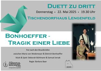 Das musikalische Schauspiel “Bonhoeffer – Tragik einer Liebe„ erzählt die Liebes- und Beziehungsgeschichte zwischen dem lutherischen Theologen und Vertreter der Bekennenden Kirche, Dietrich Bonhoeffer, und Maria von Wedemeyer zur Zeit des Zweiten Weltkriegs – die ein tragisches Ende fand. Bonhoeffer, der schon 1933 gegen die Judenverfolgung Partei ergriff und sich 1938 dem Widerstand gegen Hitler anschloss, wurde im April 1945 auf direkte Anweisung Hitlers im KZ Flossenbürg hingerichtet. Im Zusammenspiel aus Schauspiel, Musik, Sprache und Einbezug vieler Quellen ist ein Zeitzeugnis entstanden, das so berührend wie beklemmend die Liebe zweier Menschen schildert und damit just heute wieder von bestürzender Aktualität ist.