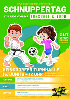Am Samstag, den 15.06.24 bieten wir für alle kleinen und großen Kinder im Alter von 4 bis 7 Jahren ein Schnuppertraining im Fußball und im Judo an. Die Kinder können sich an typischen Aufgaben der jeweiligen Sportart ausprobieren und das Fußballabzeichen erwerben bzw. sich für den weiß/gelben Gürtel im Judo qualifizieren.