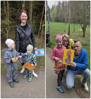 Und tatsächlich. Im angrenzenden Wald des Mühlteiches hatte der Osterhase bereits fleißig alle Geschenke hinter Bäumen, Sträuchern und Hölzern versteckt gehabt. Schnell begann die Suche, gefolgt von strahlenden Augen der Kinder und Eltern. Für die Eltern gab es selbstgebastelte Ostereier, aus denen ihre Kinder mit dem Gesicht herausschauten. Umgedreht beschenkte der Osterhase die Kinder mit gekochten Eiern, süßer Schokolade und sogar einem kleinen Sorgenwürmchen, was an schlechten Tagen den Kindern Trost spenden kann.
