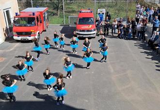Auch die Feuerwehr aus Oberheinsdorf konnte sich im Sonnenschein auf dem Schulhof präsentieren und den großen und kleinen Interessenten Vieles am und im Feuerwehrauto zeigen.