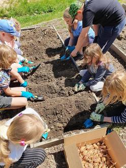 Diesbezüglich wurde nach den Osterferien das Thema Kartoffelpflanze intensiv im Sachunterricht der Klasse 3 behandelt. Dabei lernten die Kinder zahlreiche Informationen über die Geschichte der Kartoffel, die Pflanzenteile, die Entwicklung im Jahresverlauf, die Ernte, die Verarbeitung und die Schädlinge kennen. Ende April kam das Kartoffelpaket an unserer Schule an. Um gute Mutterknollen zu erhalten, ließen wir die Kartoffeln zuerst vorkeimen. Währenddessen bereiteten die Kinder im Schulgarten die Beete vor. Nach den Eisheiligen konnten die vorgekeimten Mutterknollen endlich in die Beete gelegt werden. Dabei gingen die Schüler äußerst sorgsam beim Anhäufeln vor, um keine Mutterknolle zu verletzen. Nun müssen die Kartoffelpflanzen bis zur Ernte im Herbst gepflegt werden, d.h. regelmäßig Erde nachhäufeln, Unkraut beseitigen und gießen.