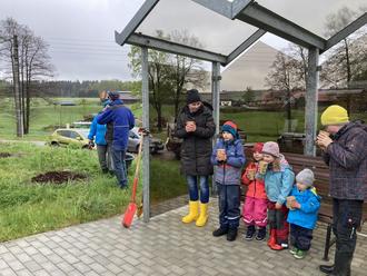 Selbst ungemütlicher Schneeregen in den Morgenstunden des 20. April und frostige Temperaturen konnten die angemeldeten großen und kleinen Helferinnen und Helfer nicht davon abhalten, die Pflanzaktion der Naschwiesen im Ortsteil Hauptmannsgrün wie geplant durchzuführen. Unterstützt durch den Bauhof, der den Pflanzen- und Werkzeugtransport sowie die Vorbereitung der bisherigen Grünflächen übernommen hat, zogen am Abzweig zum Buchenweg fünf Beerensträucher an ihren neuen Standort. Kinderbürgermeisterin Luise Junghänel und fünf weitere Kinder hatten beim Löcher graben, Pflanzen einsetzen und Rindenmulch verteilen, dem Wetter zu Trotz, sichtlich Freude. Ins bereits vorbereitete Hochbeet wurde frische Erde geschaufelt, die Erdbeerpflanzen danach liebevoll von Kinderhand verteilt, eingegraben und bewässert.
