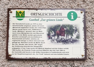 Pünktlich zu Pfingsten konnte unsere erste Infotafel an der Gaststätte „Zur Linde“ angebracht werden. Tatkräftige und finanzielle Unterstützung gab es hierbei von Inhaberin Silke Schulze. Die Tafel zeigt kurz die Geschichte der Mühle und Gaststätte und ist somit für Einheimische und Besucher gleichermaßen informativ.