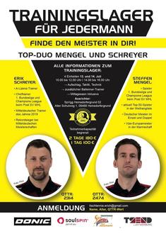 Die Abteilung Tischtennis der Spielvereinigung Heinsdorfergrund 02 e. V. wird in diesem Sommer zwei große Veranstaltungen in der Sporthalle Unterheinsdorf durchführen. Am Wochenende 13./14. Juli wird der amtierende Deutsche Vizemeister Steffen Mengel gemeinsam mit dem Waldkirchener Erik Schreyer ein Trainingslager für jedermann anbieten. Zuschauer sind natürlich herzlich willkommen.