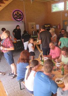 Kulinarisch wurde ebenfalls einiges geboten. Neben kühlen Getränken und leckerem Gyros mit hausgemachtem Tzatziki konnten sich die Besucher über eine Auswahl selbst gebackener Muffins und frisch gebrühten Kaffee freuen. Das Fest war eine wunderbare Gelegenheit für viele, alte Bekannte wiederzusehen und in gemütlicher Runde zusammenzukommen. So entstanden an zahlreichen Tischen angeregte Gespräche und es wurde über gemeinsame Erinnerungen und Neuigkeiten ausgetauscht.