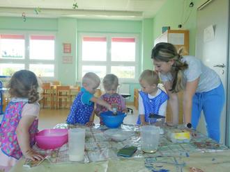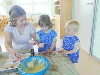 Wir hatten dazu tolle Kinderschürzen an. Jetzt mussten wir nur noch sehr gründlich unsere Hände waschen und dann ging es auch schon los. Jedes Kind bekam eine wichtige Aufgabe. Rühren mit dem Rührgerät, viele Äpfel schneiden und die Muffinsförmchen befüllen – das alles meisterten wir mit viel Geduld und natürlich kleinen Kostproben.