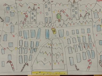 Auszeichnungen der schönsten Bilder der 1. Klassen und Texte der Klassen 2 bis 4 vom Wettbewerb des Kinderrates: „Weihnachtsschloss“ von Philipp R. aus der Klasse 1a