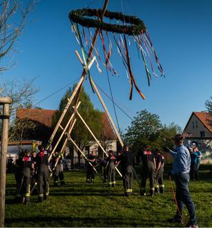 Das eigentliche Spektakel begann pünktlich um 18 Uhr und unter begeistertem Klatschen und Anfeuern wurde durch die Kameraden der Freiwilligen Feuerwehr Heidenau und Anwohnern der Maibaum aufgestellt. Traditionell kamen hier keine technischen Hilfsmittel zum Einsatz und nur mit der reinen Kraft der Männer wurde Stück für Stück der reich geschmückte Baum gestemmt.