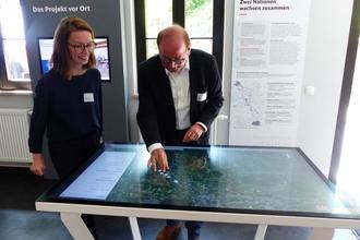 Im Infozentrum kann Bürgermeister Jürgen Opitz gemeinsam mit Christine Böhm die Varianten des geplanten Streckenverlaufs bereits virtuell verfolgen.