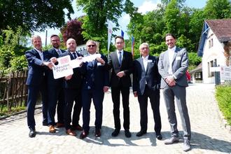 v.l.n.r. Martin Walden (DB Konzernbevollmächtigter Bahnregion Südost), Martin Dulig (stellv. Ministerpräsident Sachsens), Václav Bernard (stellv. Verkehrsminister Tschechiens), Radek `´Cech, Frank Engel (Staatssekretär), Mathieu Grosch (DB Koordinator Orient), Kay Müller (DB Projektleiter NBS Dresden-Prag)