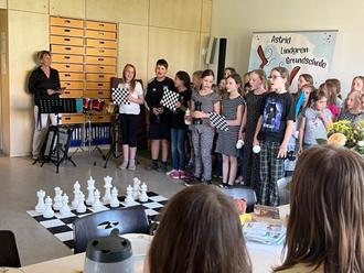 Am Donnerstag, dem 25. Mai 2023 war es soweit: In einer Feierstunde unter dem Motto „Schwarz oder Weiß“ konnten die geladenen Gäste, einige Schachspieler aus unserer Astrid-Lindgren-Grundschule, ehemalige erfolgreiche Schachspieler, Eltern, Mitglieder des Fördervereins und Lehrerinnen gemeinsam die Übergabe des Qualitätssiegels „Deutsche Schachschule“ erleben.
