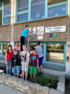 Wir befestigen unser neues Siegel „Deutsche Schachschule“ an unserer Fassade.