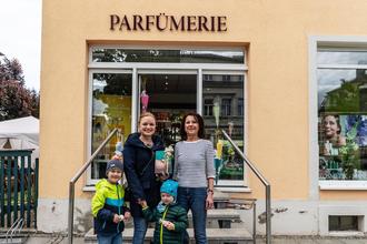 Frau Carolin Rudolph und ihre Kinder freuten sich über das Body-Vital-Set von Charlotte Meentzen, das von der Inhaberin der Parfümerie Frau Karin Küchler gestiftet wurde.