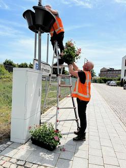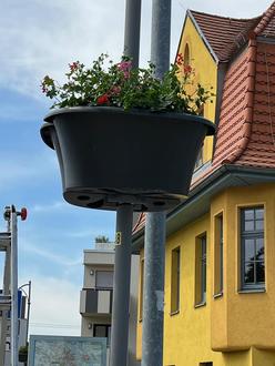 Am 14. Mai 2025 wurden 25 sogenannte Flower-Baskets (Blumenampeln) an den Straßenlaternen auf der Bahnhofstraße montiert. Schon in Kürze wird sich dieser bunte Mix aus robusten Butterfly-Hängegeranien in den Farben rot, rosa und weiß zu einer blühenden Pracht entfalten und Passanten erfreuen. Dank der beigefügten Bergminze werden die Blumenkörbe auch zu wahren Insektenmagneten. Hier finden Hummeln, Schmetterlinge und viele andere Insekten eine reichhaltige Nahrungsquelle.