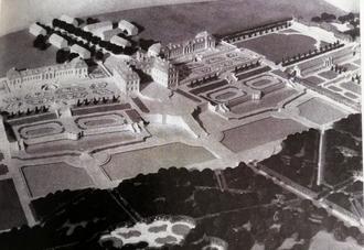 Abb. 1.: Modell der ersten Planung des Barockgartens durch Graf Wackerbarth, TU Dresden 1961. Von dieser Planung wurden das dreiflügelige Schloss und die rechte, östliche, Hälfte des Gartens mit seinen Gebäuden ausgeführt. Foto aus: „Barockgarten Dresden“ von 1980, Herausgeber: Rat der Stadt Heidenau