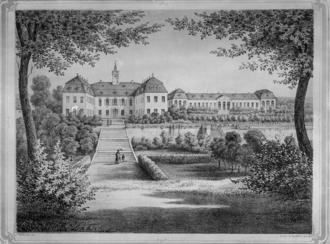 Abb. 2: Heidenau-Großsedlitz, Ansicht des Lustschlosses Sedlitz, Bauzustand um 1830, Blick von Süden auf Schloss und Obere Orangerie, © SLUB / Deutsche Fotothek /Möbius, Walter