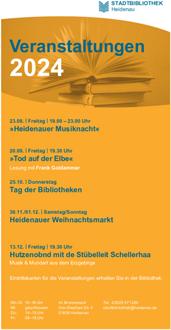 Zur Heidenauer Musiknacht am Freitag, dem 23.08. 2024, freuen wir uns auf Ihren Besuch in der Stadtbibliothek Heidenau bis 23 Uhr.