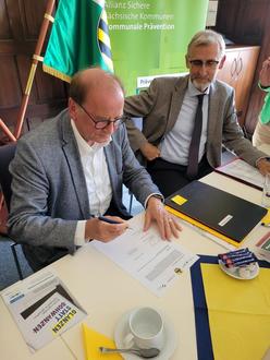 Bürgermeister Jürgen Opitz mit Innenminister Armin Schuster beim Unterzeichnen der Kooperationsvereinbarung.